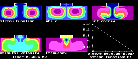 Vibration and Heat Convection in Czochralski Crystal Growth. The cold growing crystal is situated in the centre of the upper boundary. The bpttpm and the wall of the cylindrical crucible are hot. The crystal is harmonically vibrating in vertical direction. The vibrations level the distribution of a temperature in the crucible decrease the width of boundary layers. This features can have useful influence on a quality of growing crystals. The task is solved with Dr. A.I.Fedyushkin using code ASTRA in 2000.